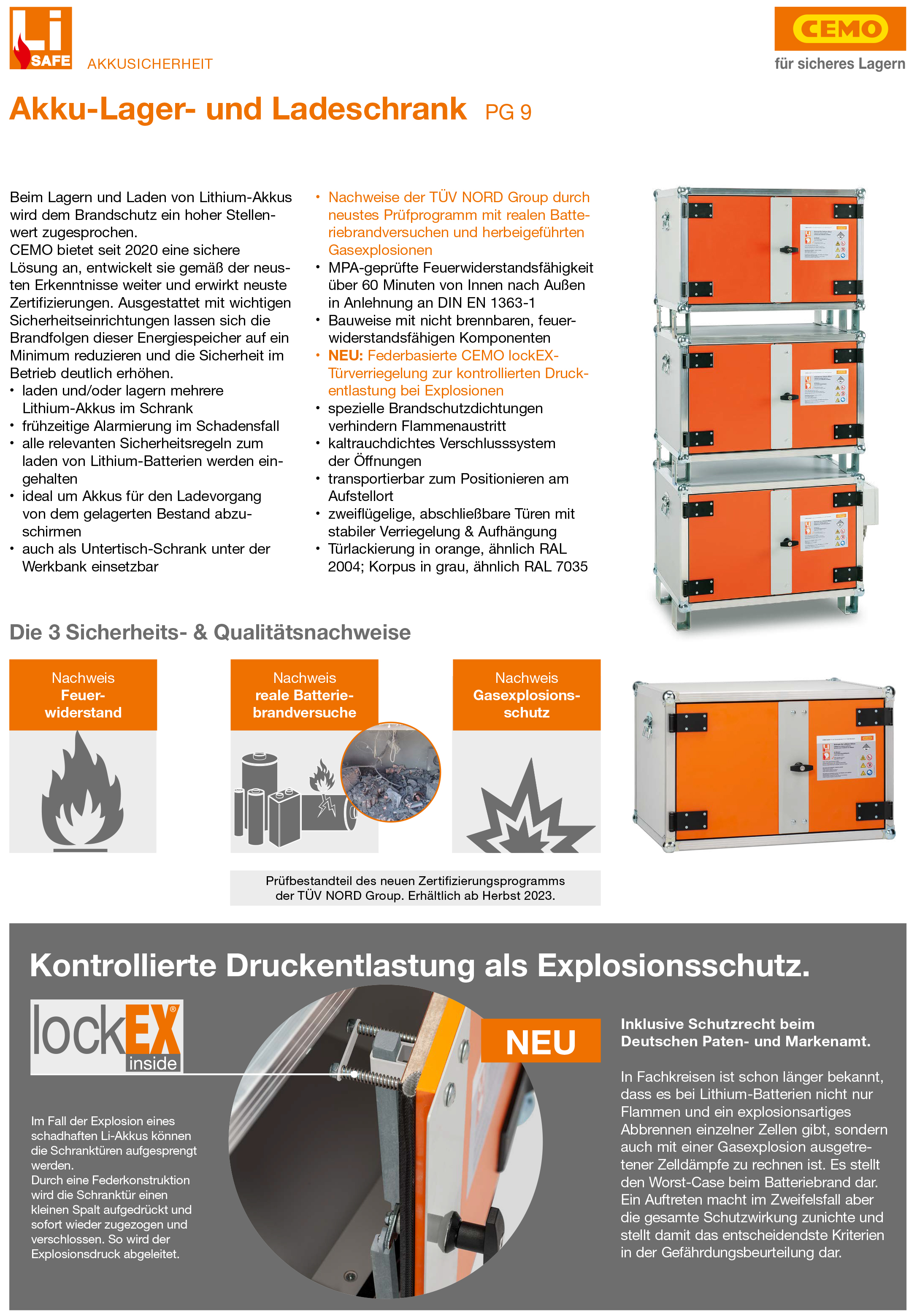 Das Risiko lässt sich nicht ausschließen, gesetzliche Vorgaben fehlen – und doch können Sie die Sicherheit in Ihrem Betrieb erhöhen: mit CEMO Produkten für das sichere Laden, Lagern, Sammeln und Transportieren. Und dem einfachen und effizienten CEMO Sicherheitskonzept: Trennen Sie Laden und Lagern !